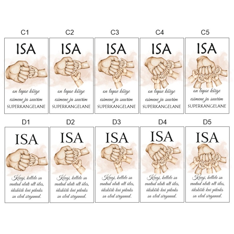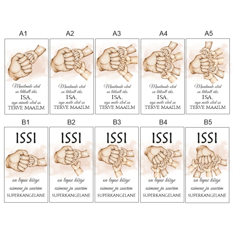 -Kujunduse valik: Vali endale meelepärane kujundus ja kirjuta tellimuse vormistamisel lisainfo lahtrisse sobiva kujunduse kood.